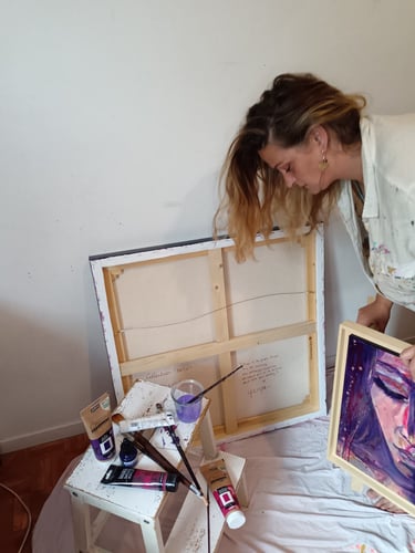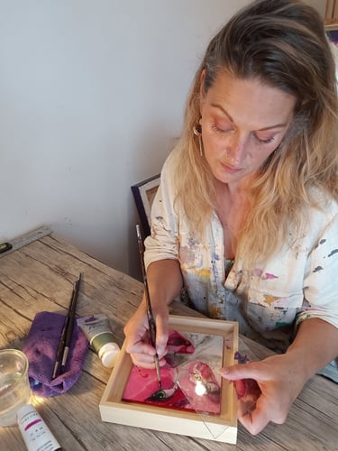 De la peinture acrylique à la résine époxy, en passant par les châssis en bois, mes choix sont guidés par un souci de durabilité et de respect. Il est important pour moi de réduire l'impact de ce que je crée, c'est pourquoi je travaille avec une entreprise française pour mes encadrements en bois naturel.