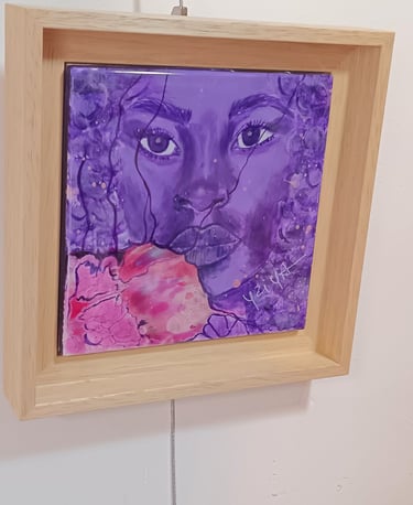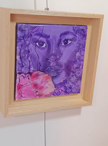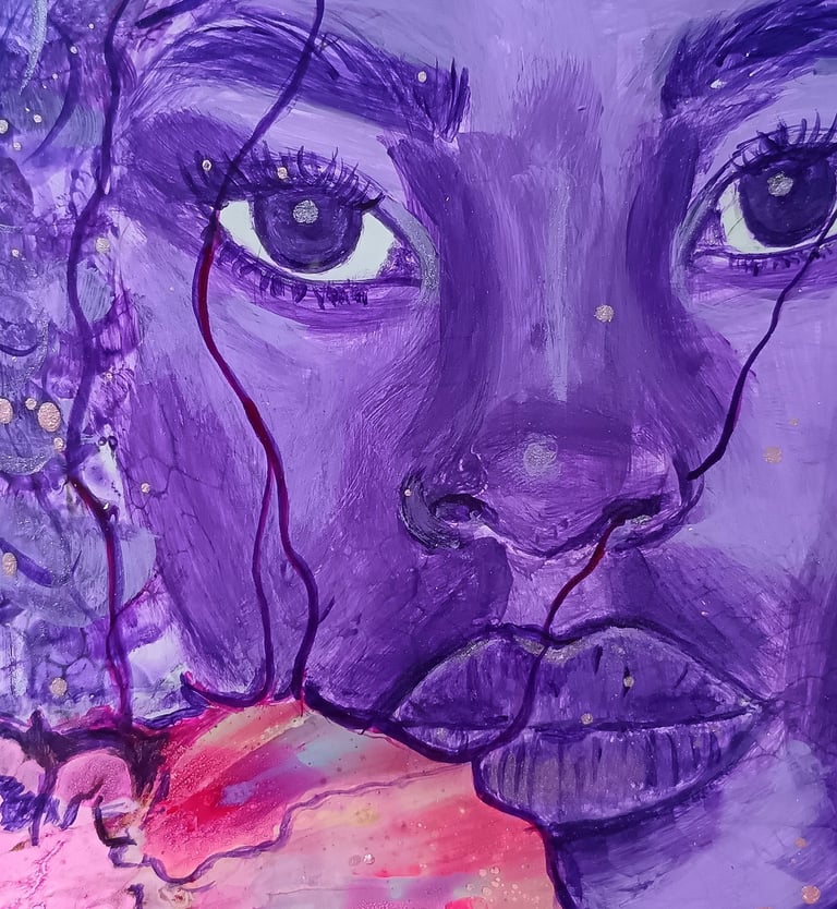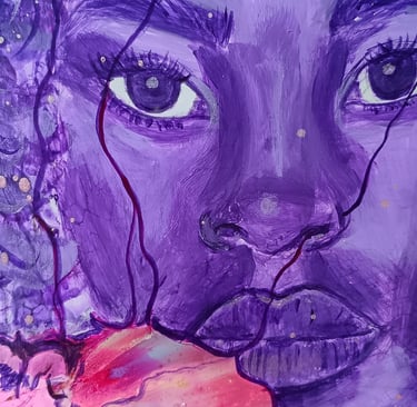 "Oubliée", pièce intime et percutante de la collection Metà, est un hommage vibrant aux femmes qui évoluent dans un monde où les défis d'être une femme sont accentués par les discriminations ethniques. Le portrait d'une femme noire, peint dans des nuances de violet, symbolise une dignité souvent invisible, une présence souvent niée.